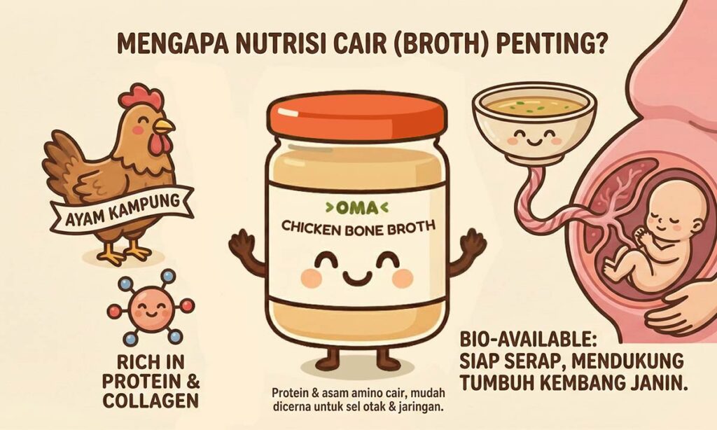 Kekhawatiran ini sangat beralasan. Fase kehamilan adalah saat di mana tubuh Bunda menjadi “pabrik” biologis yang bekerja 24 jam membentuk organ-organ vital janin. Di sinilah OMA Chicken Broth hadir, bukan sekadar sebagai makanan, melainkan sebagai “jembatan” nutrisi yang nyaman bagi Bunda dan janin.